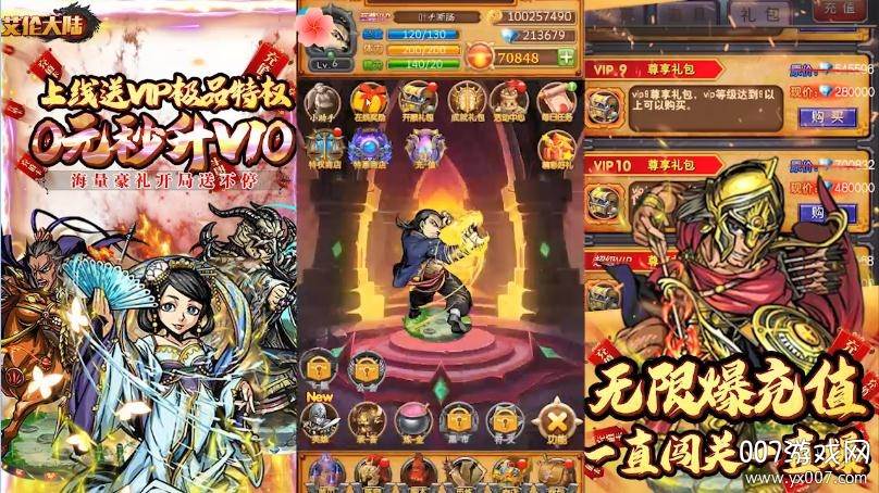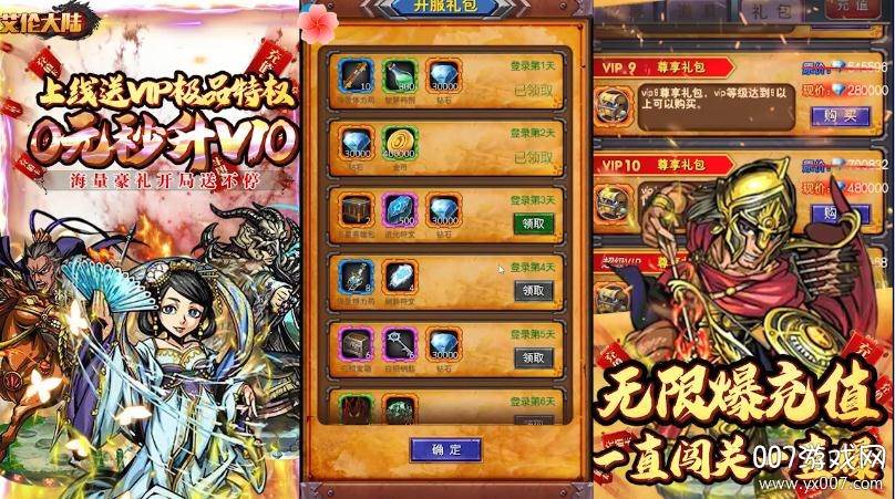 1. 登录即送VIP10,海量钻石(20万)与金币(1亿)任你挥霍。充值比例高达1:1000,首充更有双倍奖励与顶级神将相赠。