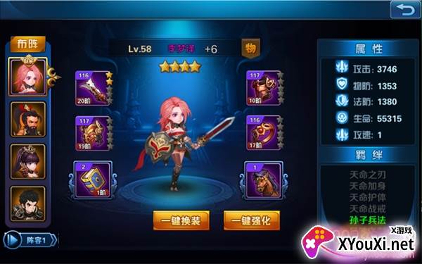 三国名将悉数登场,他们各具鲜明的属性与技能。结合武将自身的职业定位(如“先锋”、“猛将”、“神射”、“军师”、“谋士”)以及“羁绊”等特殊效果,40余位武将能够组合出千变万化的阵容搭配,策略深度十足。
