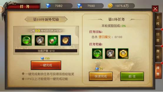 1转10级以上即可接取日常任务,是每日经验和金币的重要补充。 10环任务以击杀野外怪物为主,可消耗绑定钻石一键完成并获得多倍奖励。 前期积累的绑定钻石非常可观,推荐每日使用,领取翻倍经验。 (一键完成需VIP4以上)
