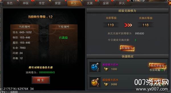 当您达到80级,转生系统将为您开启战力飞升的新篇章。十二个转生等级,每提升一级,都意味着角色属性的显著增强,战斗力跃升。每个转生等级不仅拥有华丽酷炫的专属装备,更蕴藏着令人惊叹的强大属性。想要提升转生等级?消耗转生修为即可!修为可通过活动、礼包、商城中的修为丹获得,亦可直接消耗经验和金币兑换,助您轻松突破极限。