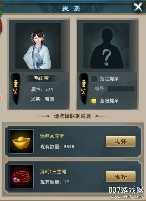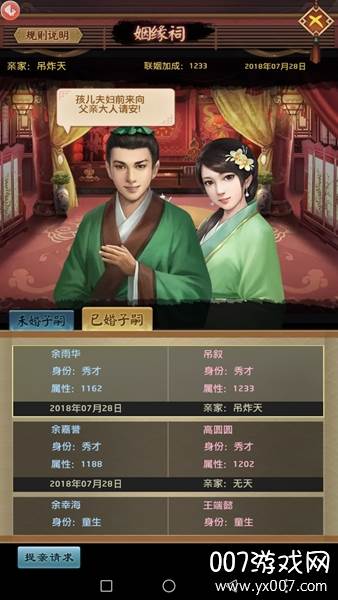 在这里,你的成年儿女,在媒婆的巧手撮合下,可以与同服的其他玩家儿女结为秦晋之好。成功结亲,便意味着你成功“嫁”出女儿,或“娶”进儿媳。无论女婿还是媳妇,都会为你的家族带来意想不到的属性增益。