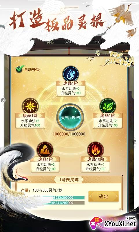 5. 灵根升级,法阵加持,不仅能提升灵气收集上限,更能强化五行灵根,全面提升角色属性。收集到的灵气,亦可用于技能的精进。