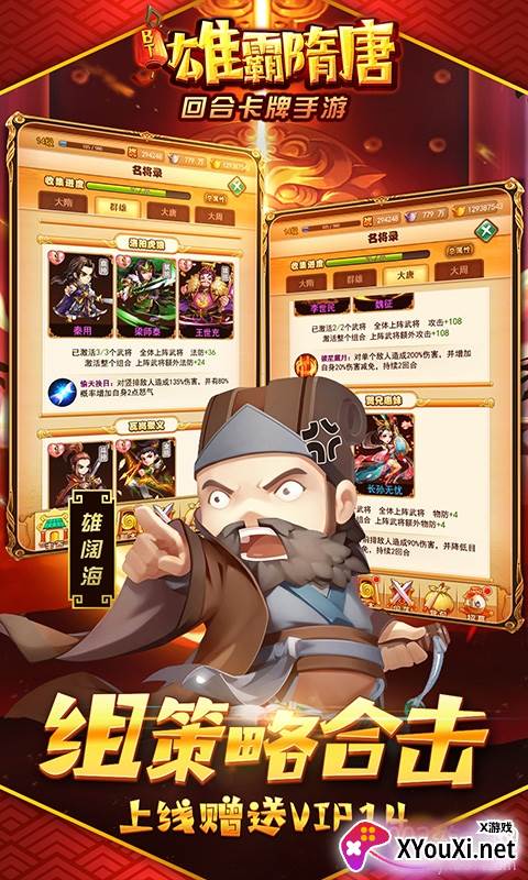 《雄霸隋唐:天下无双》震撼来袭!这是一款集策略、养成与热血PK于一体的回合制卡牌挂机手游。甫一上线,即赠送尊贵的V14特权,海量福利登录即领,更有免费双百连抽助你赢在起跑线!无限商城0元开启,让你轻松集结无双神将,巧妙排兵布阵,共谱属于你的隋唐传奇!