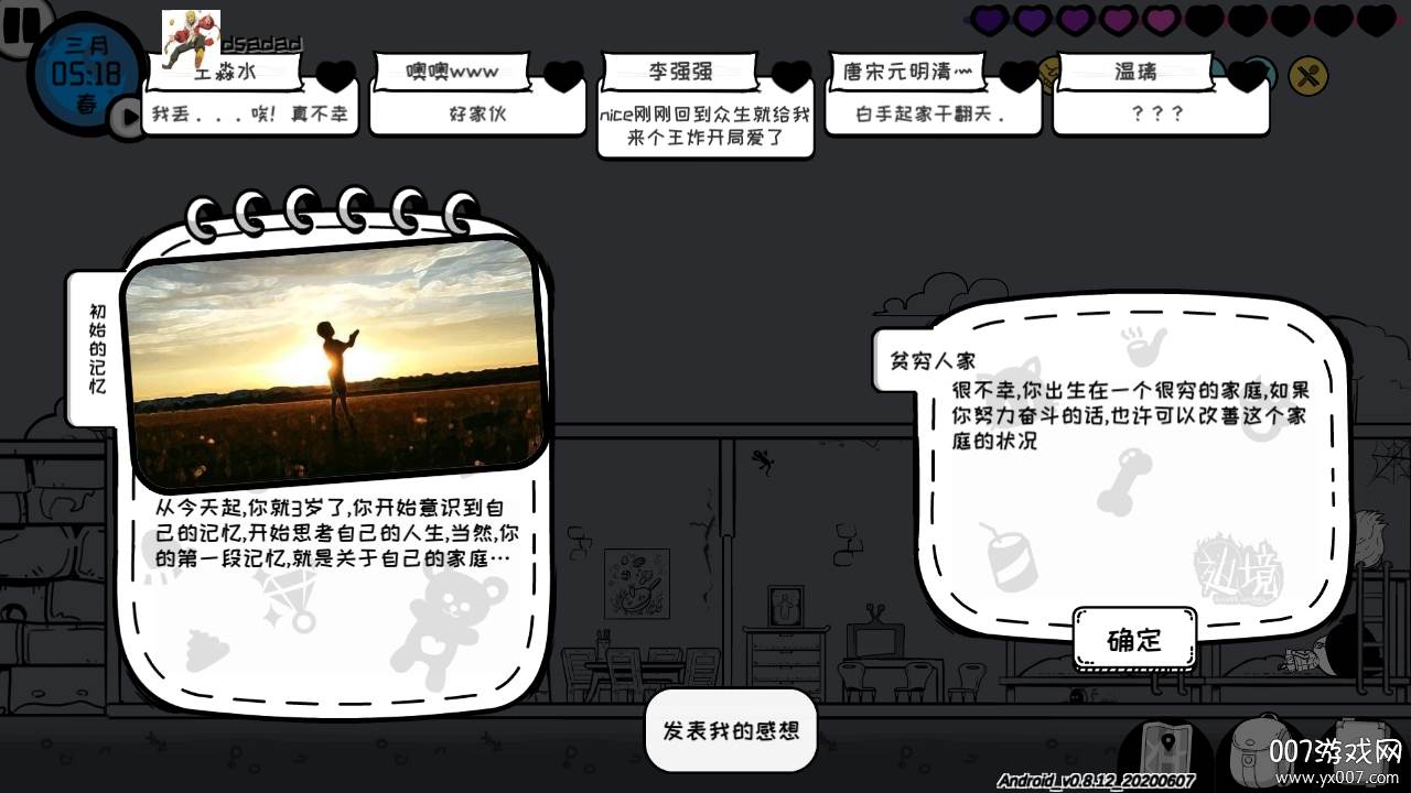 这款游戏的核心在于模拟人生。初入游戏,你会被赋予一个随机的身份和家庭。游戏界面简洁,以黑白配色为主,营造出独特的氛围。面对未知的游戏世界,设定一个清晰的目标至关重要,否则很容易迷失方向。