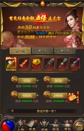 - 首充奖励翻10倍,赠送绝版传世套装;次充亦享双倍返利,惊喜不断。