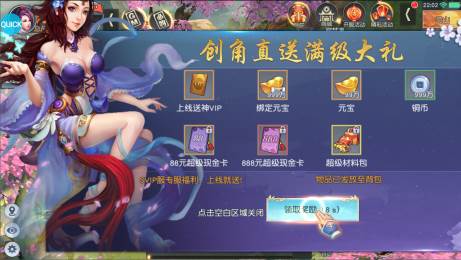 - 创角即送:满V特权、100万元宝、1000万绑元、1000万金币,更有坐骑满阶材料助你起步!