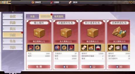 累充100元礼包:勾玉*5000,修为丸子*30,SR万能碎片*10