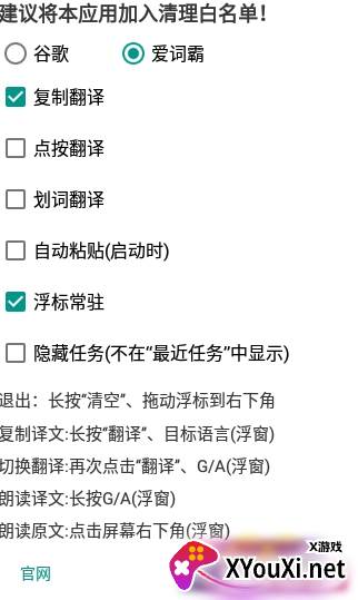 * **滚动长译文:** 启用后,即使文本过长也能完整翻译,但可能影响应用的滚动或点击操作。