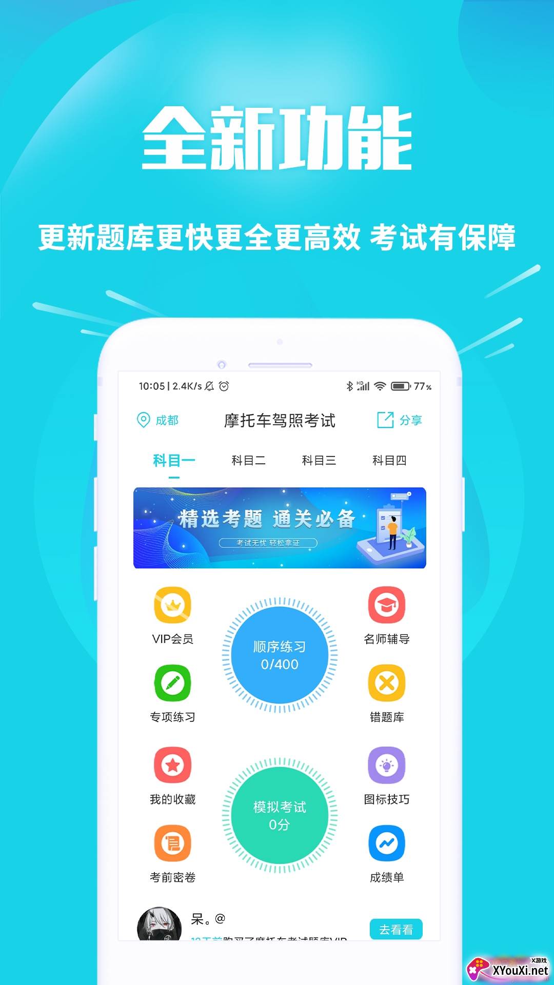 还在为考取摩托车驾照而烦恼吗?“摩托车驾考助手视频教程版”这款专业的题库软件,将成为您备考路上的得力助手!它汇聚了海量、时新且与您报考地点紧密相关的题库资源,更有顺序练习、模拟考试、专项练习等多种灵活的刷题模式,助您事半功倍,高效通关。不止于此,科目二和科目三的视频课程也一应俱全,让您的学习过程更加直观生动。