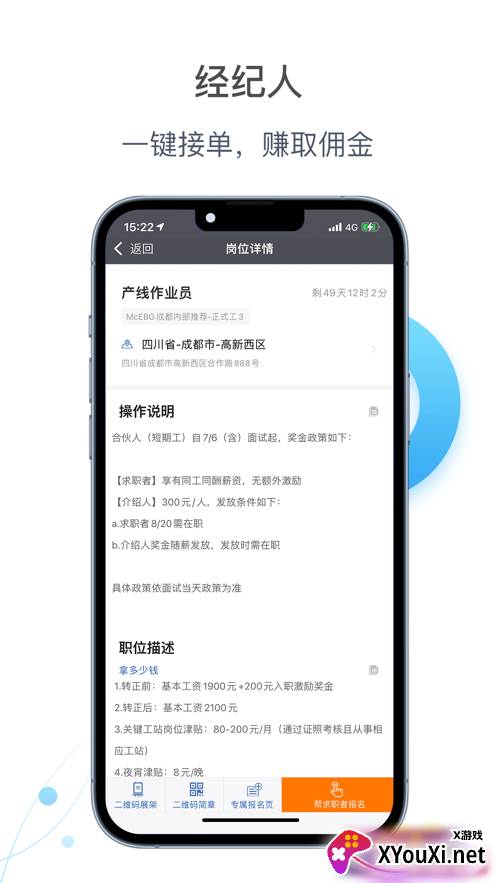 2. 推荐好友专区:提供“职位介绍”、“接单报名”、“二维码展架”等工具,方便您分享机会,互利共赢。