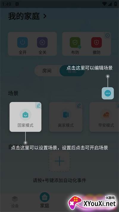 4. 熟悉设备设置后,在底部导航栏的板块,您可以根据图示功能,便捷地编辑和开启您预设的智能场景。