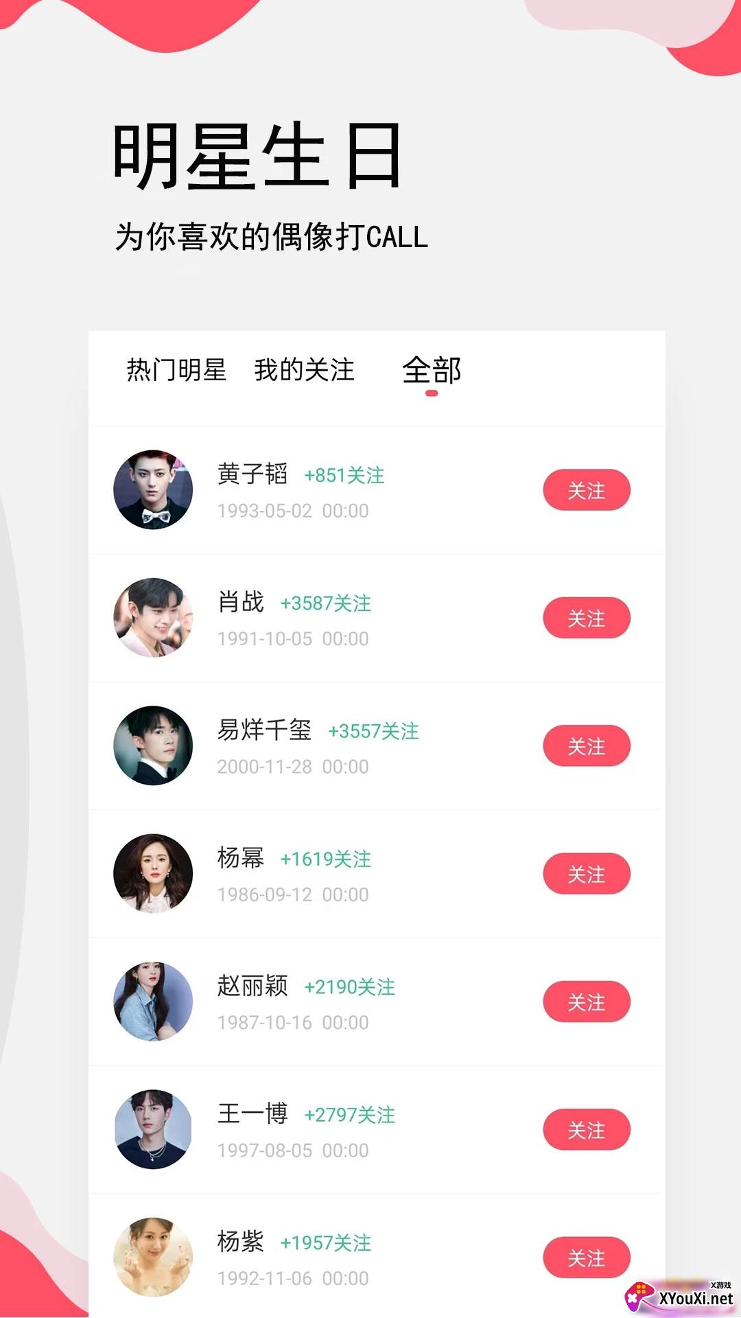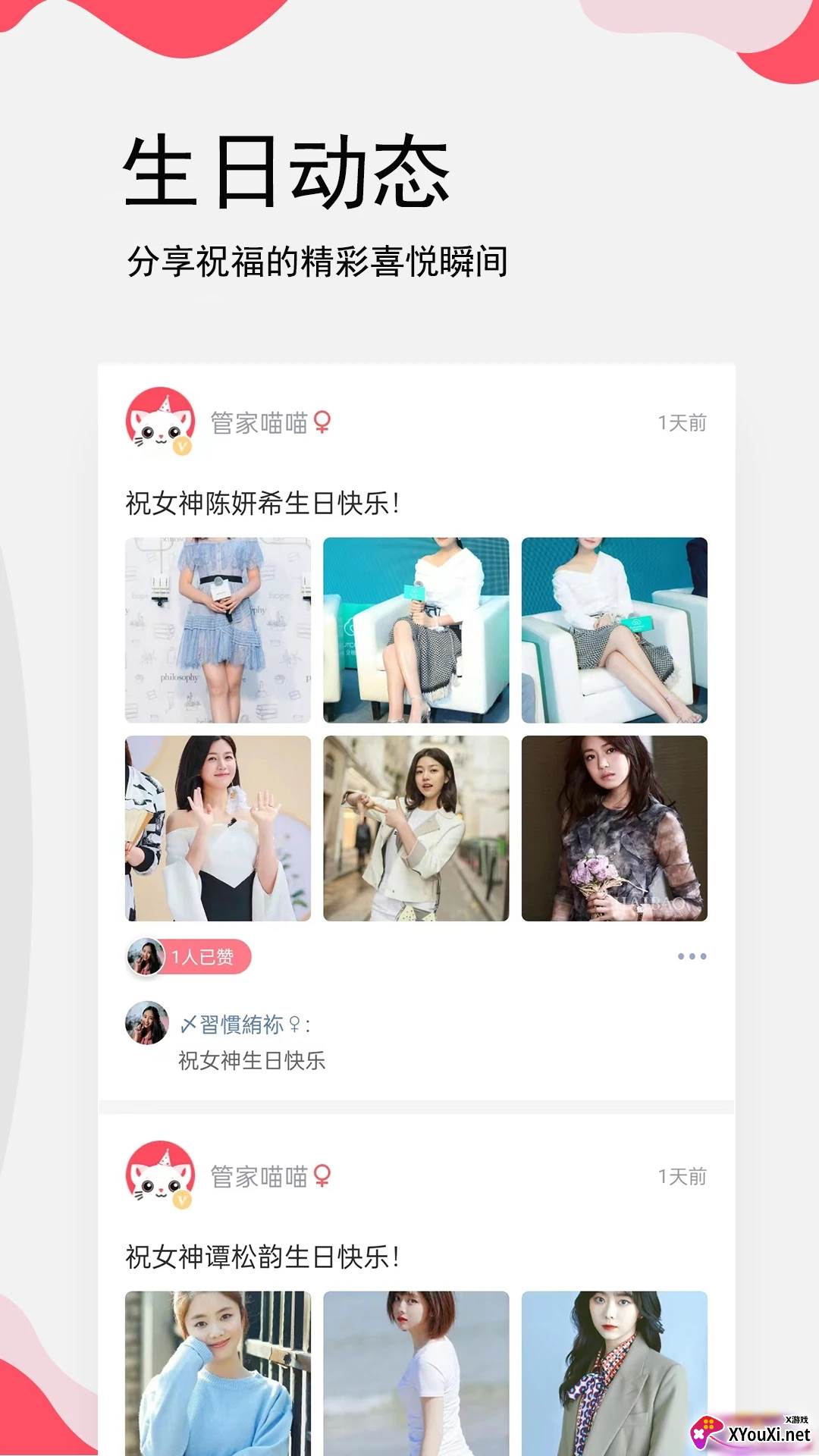 - 星光闪耀,偶像同庆: 实时提醒您关注的明星生日,与全球粉丝一同为偶像打Call。