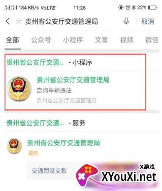 第一步: 在微信搜索框中输入“贵州省公安厅交通管理局”并进入小程序。