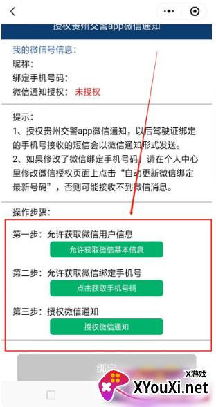 第三步: 按照页面提示,依次点击“操作步骤”中的第一、二、三步的绿色文字,并依次允许获取您的微信基本信息、手机号码以及微信授权通知等权限。
