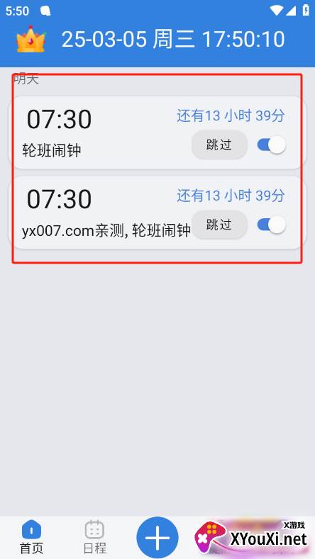5. 添加成功的闹钟将清晰地显示在首页,一目了然。