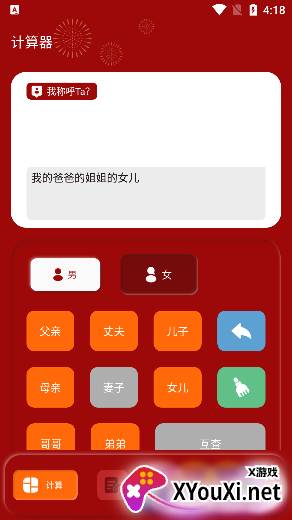 还在为称呼长辈而头疼?别担心,一款名为“社恐亲戚计算器”的APP将是你的福音!这款软件操作简便,只需输入你与某位亲戚的关系,它便能自动为你计算出正确的称呼,从此告别叫错人的尴尬。喜欢的朋友们,还在等什么?快来下载体验吧!