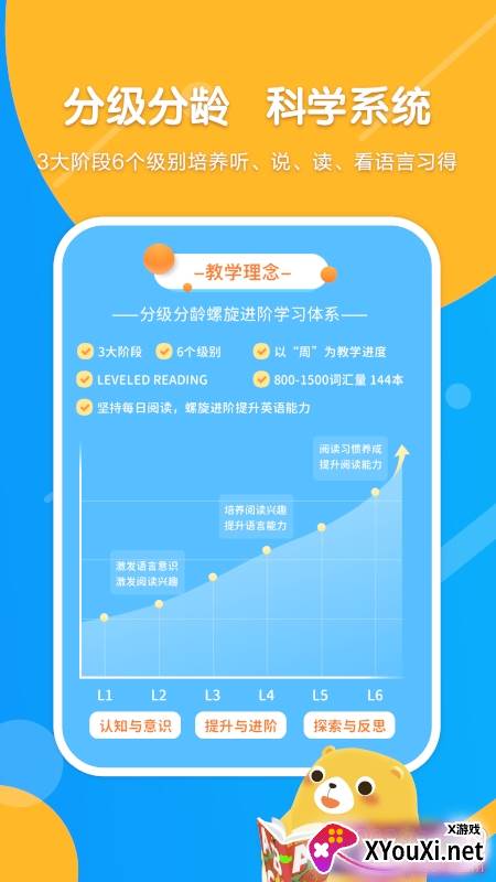 软件采用科学的分级学习模式,分为3大阶段、6个进阶级别。以“周”为单位规划学习进度,循序渐进地激发孩子的语言感知力,培养其阅读兴趣,并全面提升语言运用能力。