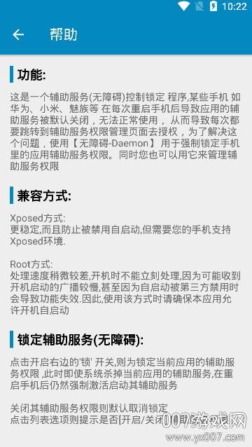 操作简便,一键锁定。只需轻触右侧的“锁”图标,即可为当前应用的辅助服务权限加锁。即使系统后台强制关闭,抑或手机重启,其辅助服务也能被强制激活,恢复正常运行。若想解除锁定,再次操作即可。您还可以通过点击列表中的应用选项,便捷地开启或关闭其辅助服务权限。