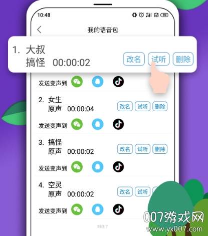 – 支持DIY录制个性语音包,瞬间变身萝莉、大叔、搞怪、空灵、惊悚等多种音效,创意无限。