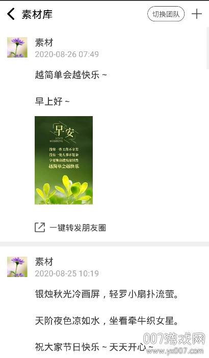 :支持团队素材一键转发,方便团队成员共享资源,提高协作效率。