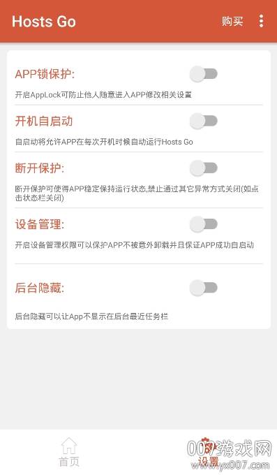 为了保障你的隐私和应用安全,“HostsGO”提供了多重保护机制。你可以设置应用锁,防止他人随意打开;开启运行隐藏,让它在最近运行列表中消失,避免被强制关闭;断开保护则能确保应用始终保持运行状态,防止被随意中断。更有卸载保护功能,让你不必担心应用被意外删除,配合开机自启动选项,更能确保它在你需要时随时待命。同时支持 DNS 和 Hosts 修改,让你一站式解决网络优化问题。