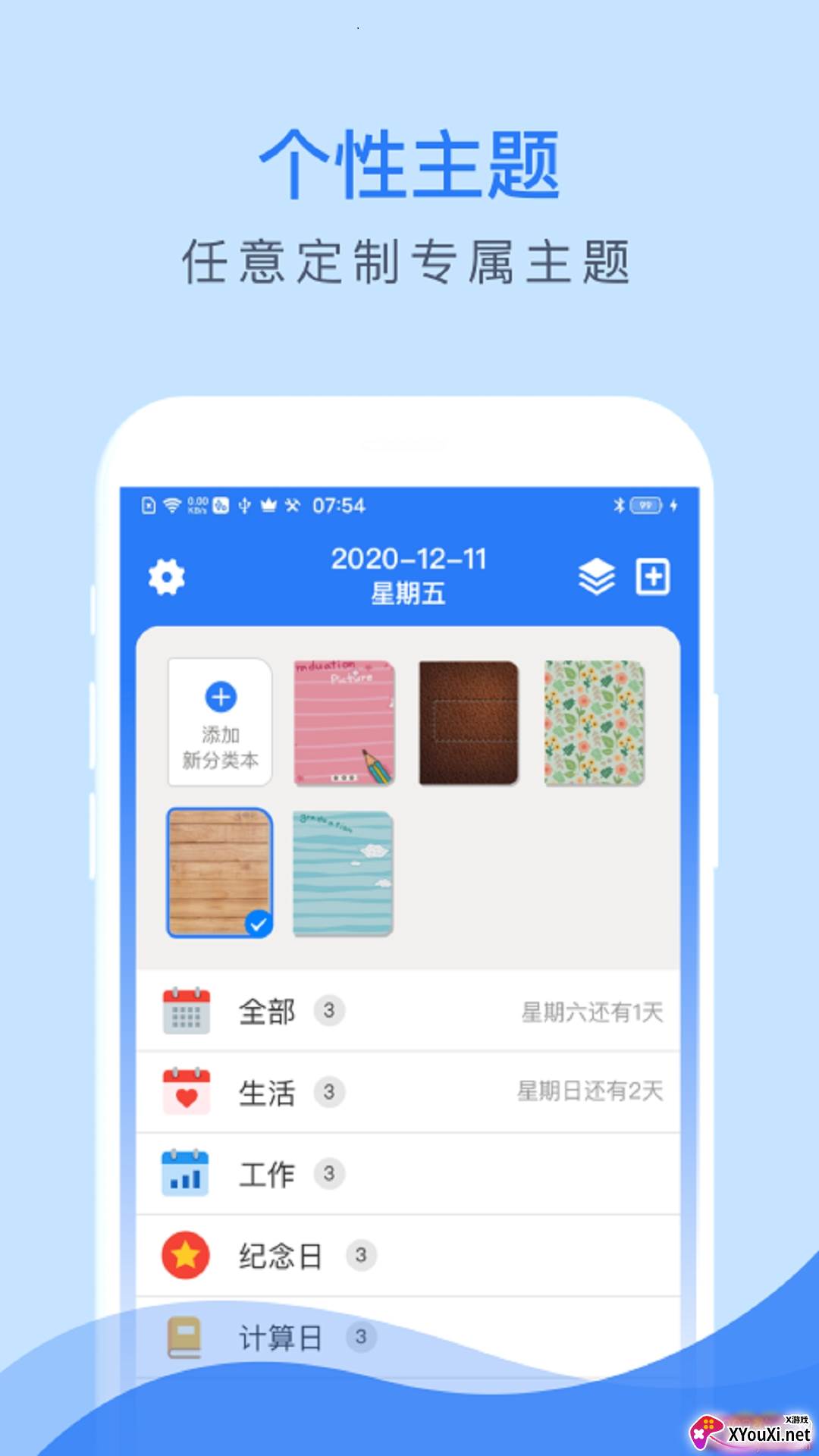 3. 预设分类,自由扩展:默认提供生活、工作、纪念日三大分类,更能自定义娱乐、学习、节日等,满足你多样化的需求。