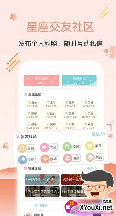 - 人气星友社区: 打造12星座专属的交友平台,在这里,你可以畅谈星座话题,分享生活点滴。