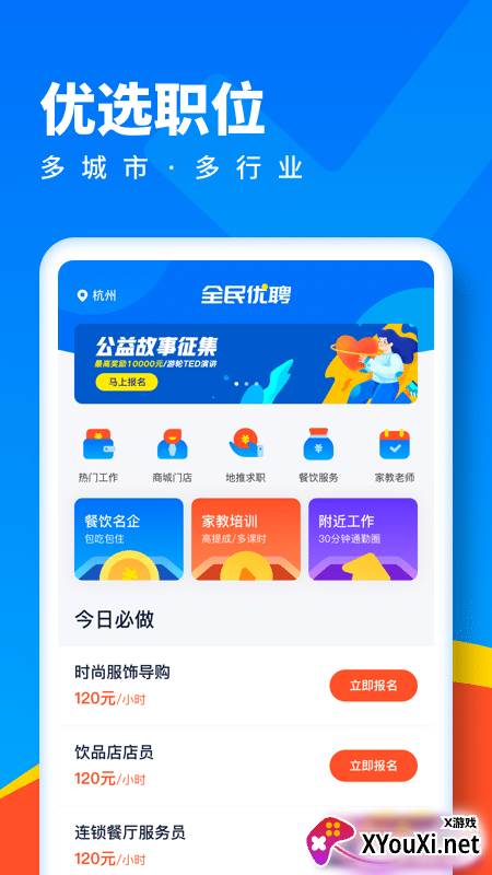 全民优聘,为您的职业生涯注入活力!无论您寻求全职的稳定,还是兼职的灵活,无论您身在哪个城市,这里都有广阔的天地等待您。轻松掌握工作详情、薪资待遇,一键投递简历,快速预约面试,让您高效寻得心仪工作,开启精彩职业旅程。