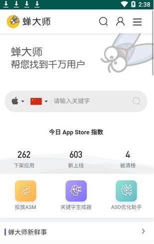 想要在应用商店脱颖而出?蝉大师ASO优化工具,无疑是您提升应用排名的得力助手!这款工具不仅界面设计简洁大方,操作更是直观易懂。它能让您随时随地掌握时下热门搜索词汇,并一览无余其指数排名,为您的优化策略提供坚实的数据支持。