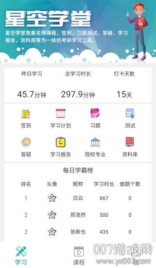 星空考研,以服务为本,旨在为考研学生提供一个高效、可靠、实用的备考平台。涵盖了课程录播,签到打卡,测评答疑,资料库等功能。