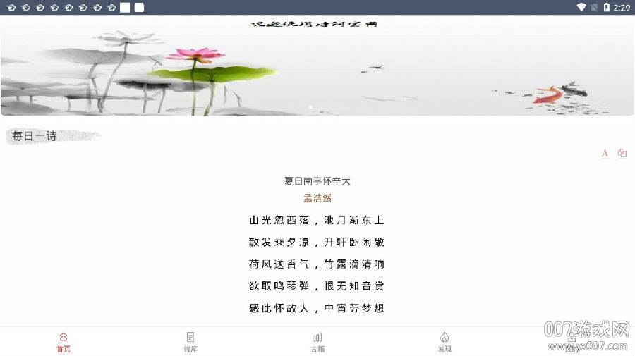 - 每日一诗: 首页随机推送当日诗词,助你养成每日背诵的好习惯。