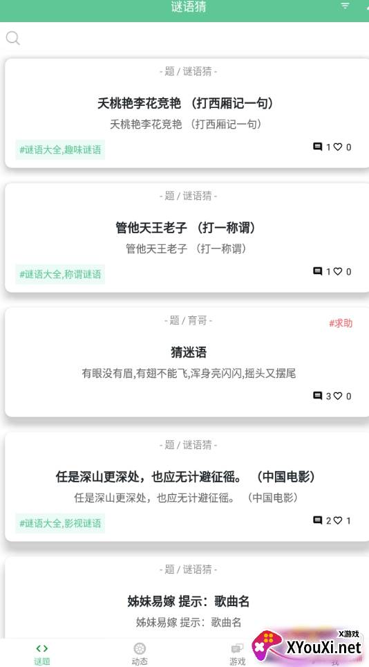 3. **畅游谜海,随心选择**:点击“游戏”入口,即可发现应用内全部的谜语资源。您可以自由选择喜欢的谜语类型,在线进行猜谜游戏。
