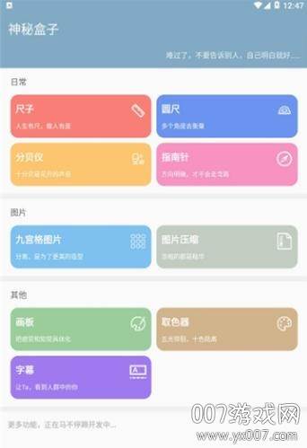 还在为手机里塞满了各种功能单一的小工具而烦恼吗?“神秘盒子”手机多功能工具合集版,这款集万千实用功能于一身的软件,将彻底解放你的手机空间!它不仅内置了指南针、尺子、图片压缩、字幕翻译、声音测量等一系列令人惊喜的实用工具,更以其强大的功能和便捷的操作,让你在日常出行和生活中从此告别手忙脚乱,尽享无忧生活。
