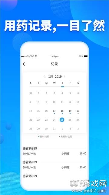 3. 用药记录,回溯便捷:每一次服药的时间,每一次的遗忘,都清晰记录,让您的用药历史一目了然。