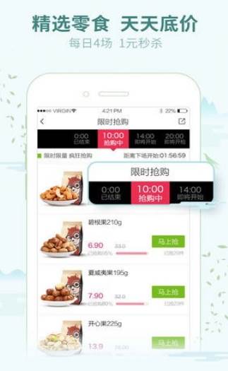 6、限时抢购:每天四场限时抢购,夏威夷果、碧根果等爆款零食低至1元,手慢无,拼的就是速度!