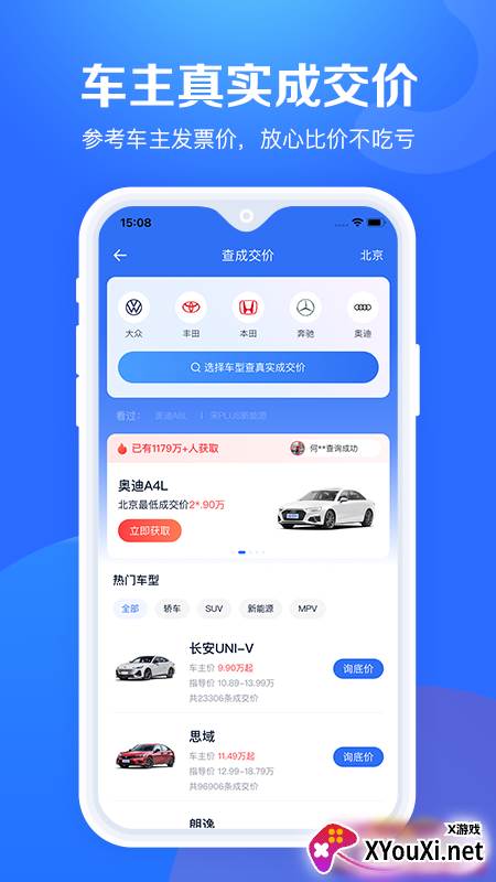 - 购车攻略,省钱有道: 实时掌握本地最新的降价促销信息,不错过任何团购优惠。更有“询底价”功能,一键获取真实成交价,让您省去与经销商周旋的烦恼。