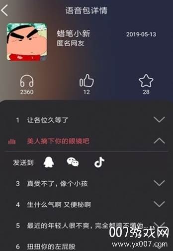这款语音包变声器功能多样,几乎能满足你在各种场景下的需求,无论是日常聊天、激烈游戏还是语音通话,它都能游刃有余。特别是在《王者荣耀》、《和平精英》等热门游戏的开黑时刻,它能让你瞬间成为焦点。而且,它还能无缝兼容微信、QQ、抖音等社交平台,让你的变声体验更加便捷。其丰富的素材库更是令人称道,从热门游戏角色到声优模仿,从萌妹子、暖男到日语、搞笑段子,甚至是李云龙、小猪佩奇等经典IP,应有尽有,总有一款能戳中你的笑点。