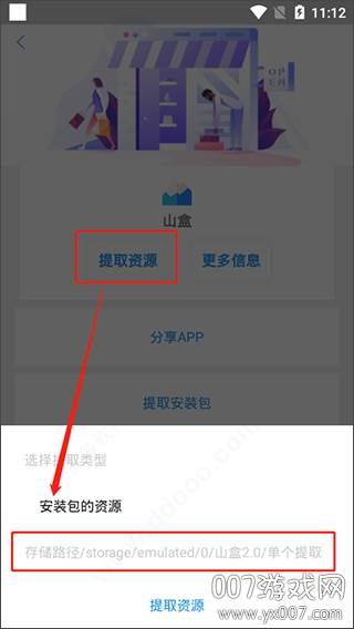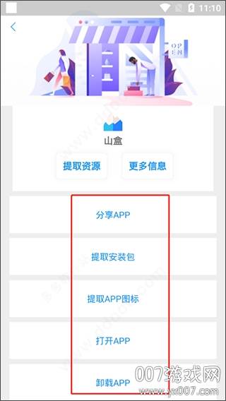 3. 选择您需要提取的APK。以“山盒”为例,您可以进行分享、提取安卓版、提取图标、打开应用或卸载应用等多种操作。