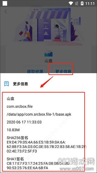 4. 点击“更多信息”,便可查阅应用的包名、版本号、大小、SHA256签名、SHA1签名等关键信息。