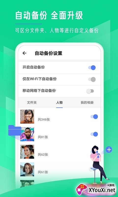 智能自动备份:支持按文件夹、人物等维度进行细致的自定义备份,告别手动操作的烦恼。