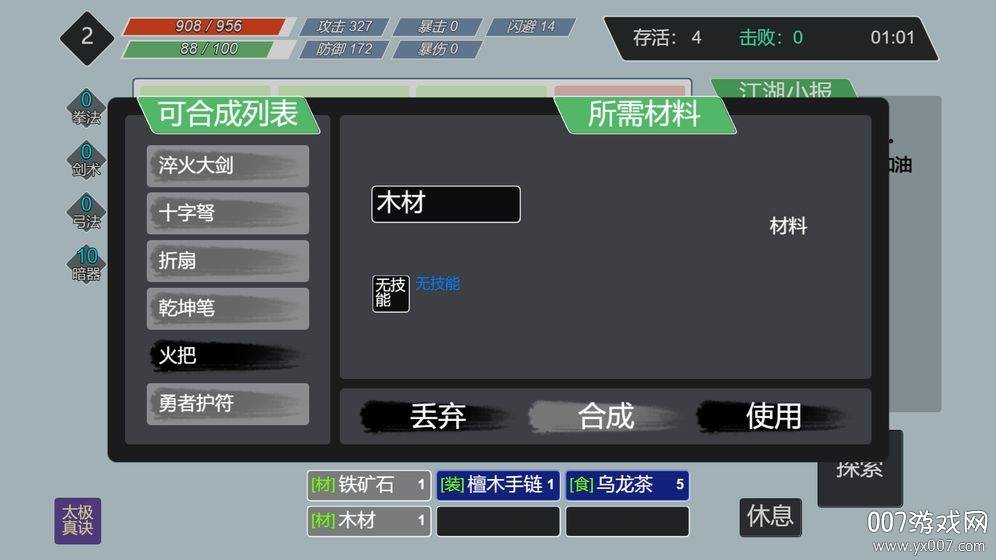 右上角的等级标识,不仅是身份的象征,更是你属性与装备的直观展现。左上角的存活人数,让你一眼洞悉战场局势,知晓群雄踪迹。装备合成,只需轻轻一点,所有绝世秘籍配方尽收眼底。切记,红色区域危机四伏,倒计时结束前务必安全撤离,方能在这乱世中立足。