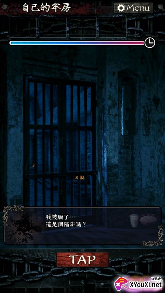 - 回到自己的牢房,触发剧情。点击“等待看守”按钮度过一天后,可以点击铁栅栏门旁边的米饭和水。