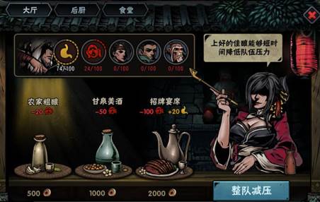 酒楼内设大厅、后厨及食堂。大厅是玩家放松身心、解除负面状态的场所,提供农家粗酿(减压20)、甘泉美酒(减压50)和招牌宴席(减压100)等多种饮品,每次使用均能为全队带来减压效果。玩家可根据自身需求选择不同档次的酒水,越好的酒减压效果越显著,价格自然也更高。