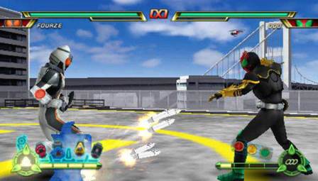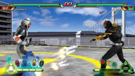 Fourze的招式操作相当直观。方向键自然不用多说,上键是跳跃,下键用于聚气,后退则能进行防御。L和R键相当于左右闪避,让你在战场上更加灵活。方块键是轻攻击,X键则是强力攻击。圆圈键是小必杀技,可以配合方向键打出不同的效果。而三角键则是需要消耗满能量的超必杀技。左下角的圆形滑块,是切换开关和形态的核心。所有角色在操作上都有共通之处:方块是轻攻击,叉是重攻击,圆圈是可配合方向键的小绝招,三角是满能量大招,摇杆负责形态变换,L和R键则用于闪躲。