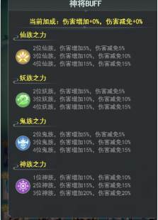 当上阵相同种族的神将达到一定数量时,便能激活相应的种族加成buff。例如,同时上阵三位仙族神将,便可获得10%的伤害加成和10%的伤害减免。其他种族的神将,也遵循同样的加成规则,唯独神族略有不同。