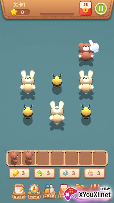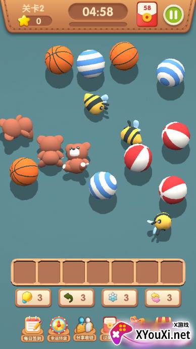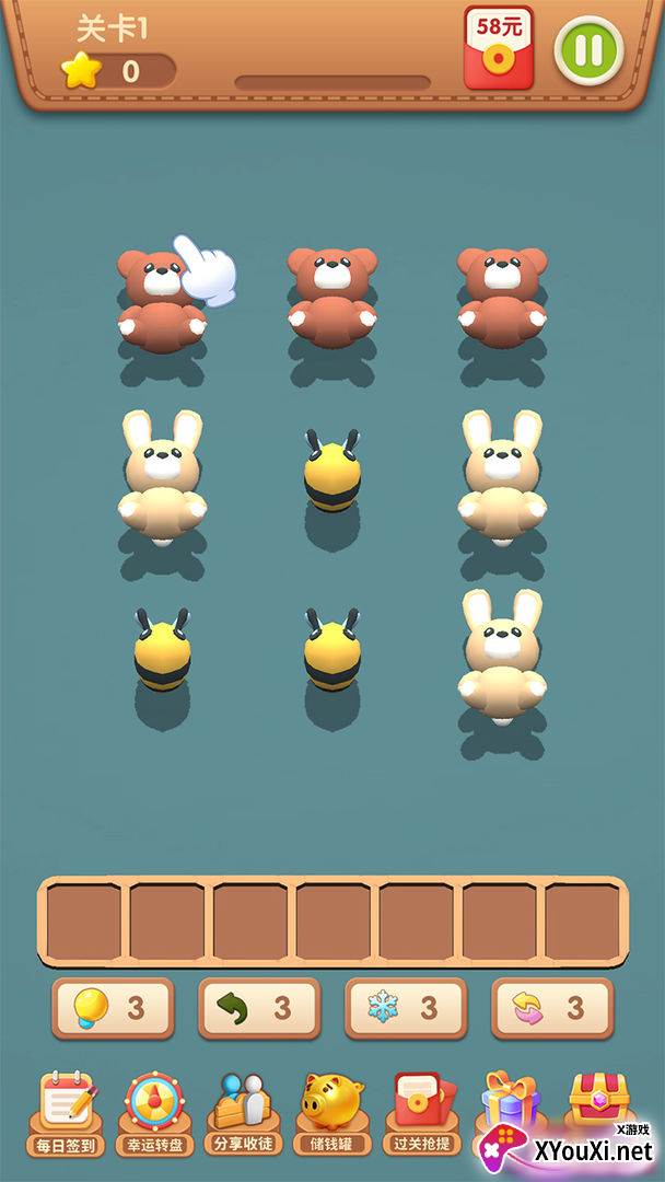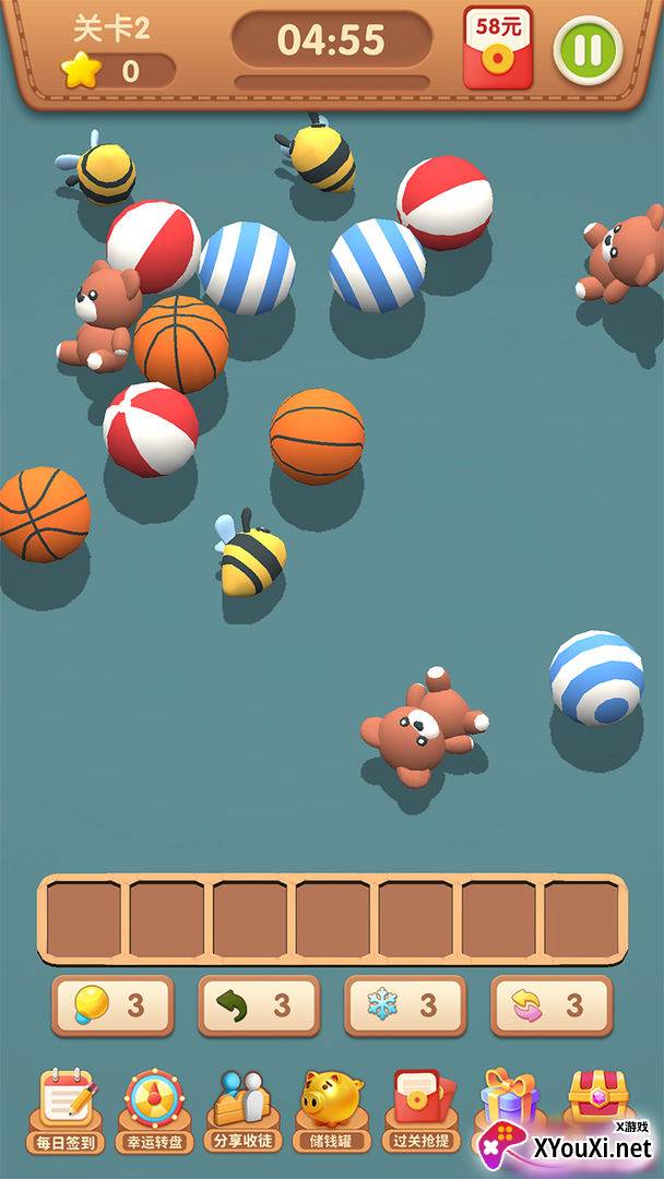 轻点三个同类物品,它们将自动归位至下方格子并消除得分。