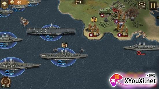 - 在红圈机场与敌方黄圈之间建立防线(难度较大),需应对敌方船只的骚扰。
