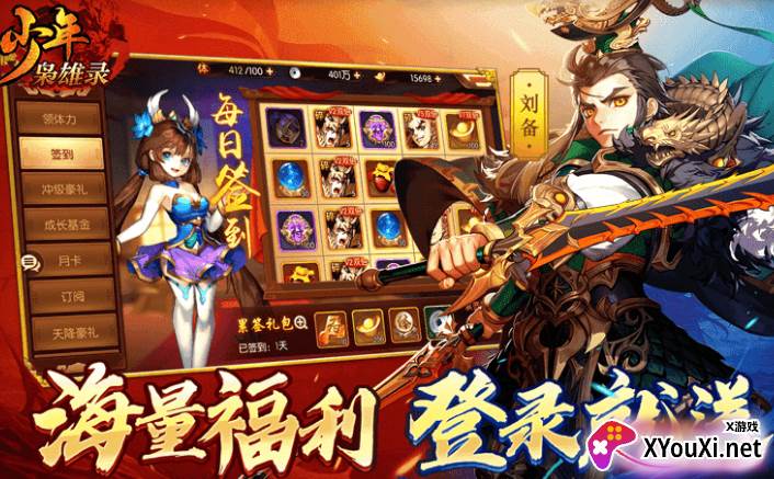 登录豪礼,福利爆棚:游戏秉持高福利策略,开服前八日,每日登录即可领取丰厚奖励,包括两次十连抽、海量元宝及绝世红装!仅仅签到三天,便可获得稀有时装。开服七日内,每日完成武将养成、装备培养、竞技场挑战、寻宝等任务,积累积分,兑换海量成长资源,更有机会解锁稀有红将“赵云”!