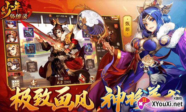 国漫风尚,少年三国:汇聚百名顶级画师,倾力打造少年武将的颜值巅峰。无论是威武霸气的曹操,调皮可爱的小乔,还是英姿飒爽的赵云,三百余名三国名将均以十六岁的少年形象完美呈现。每一个表情、动作都栩栩如生,独具匠心。