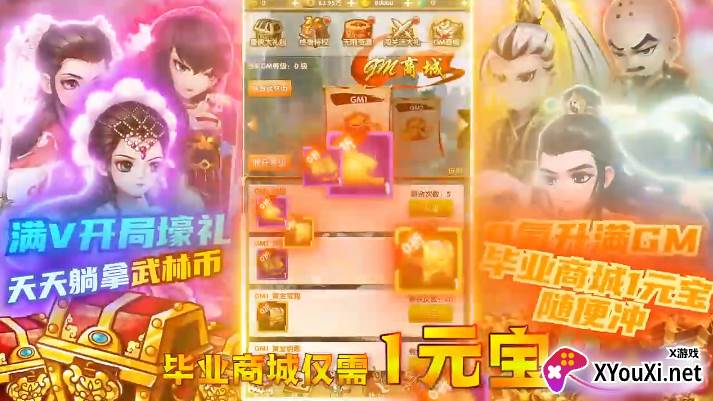 :免费升级至满GM,毕业不是梦!紫金、幻彩应有尽有,限定称号、海量材料触手可及,一切道具仅需1元宝!GM特权令在手,至尊称号、顶级侠客自选宝箱、专属抽奖转盘、每日武林币,样样不落!